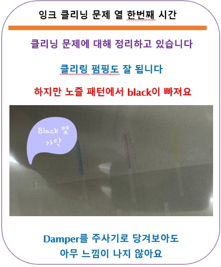 - 이렇게 문제가 해결된 줄 알았으나, 인쇄 작업 시 동일하게 black ink가 나오지 않고, 노즐 패턴 인쇄 시 다시 black ink가 제대로 나오지 않음.
