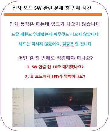- 모션 정상 + 출력 0이면, 헤드 막힘이 아니라 헤드-보드 통신(SW 타이밍/신호) 문제일 수 있습니다.