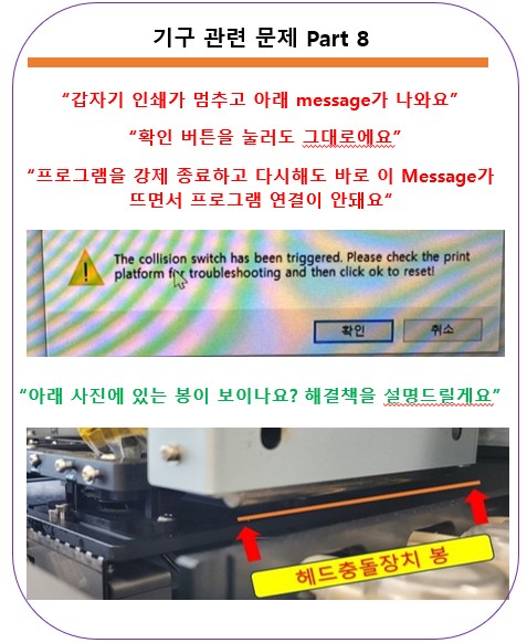 - 메시지 내용: “헤드 충돌 센서가 작동 중입니다. Flatbed 위 소재를 제거하고 다시 Software를 가동하세요.”