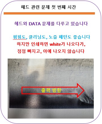 오늘은 전자 보드, 헤드, DATA cable 등 이미지 DATA와 관련된 문제, 첫 번째 시간으로 헤드 혹은 DATA cable이 오염되었을 때 나오는 문제에 대해 설명합니다.