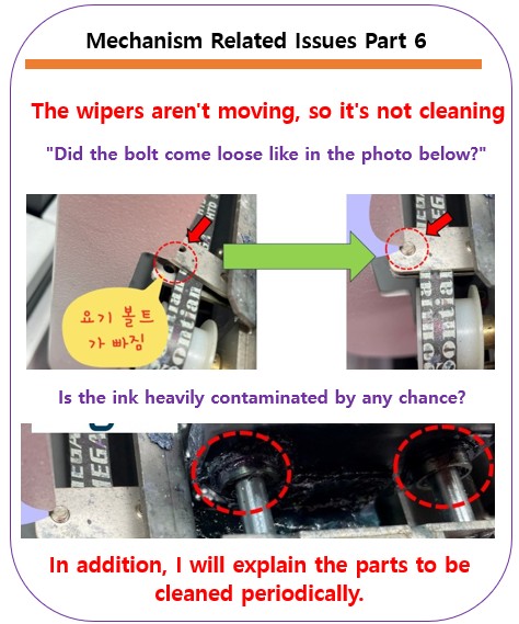 - Wiper not moving: two main causes — ① loose screw on belt linkage plate → retighten / ② ink contamination buildup → clean
